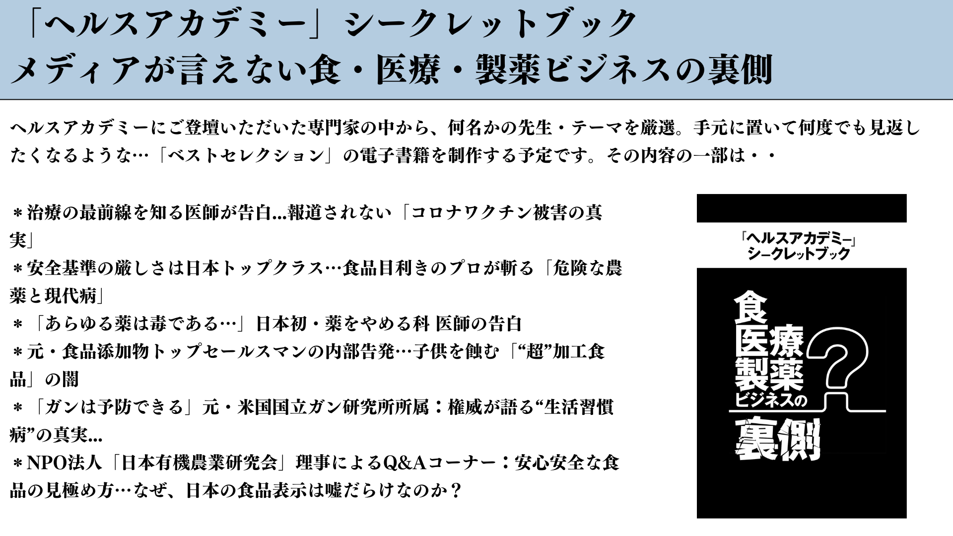 ヘルスアカデミーは、本当に患者を救いたいと思う信念のある、医師、研究者、専門家が、毎月、医療・食に関する最新の研究結果をお届けするサービスです。